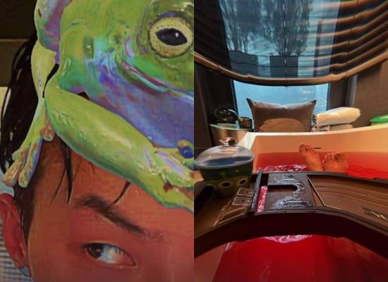 또 다른 사진 속 지드래곤은 휴대전화 사진 앱을 사용해 개구리 스티커를 붙인 자신의 모습을 공개했다. 물에 젖은 채 자신의 옆을 곁눈질 하는 얼굴이다.