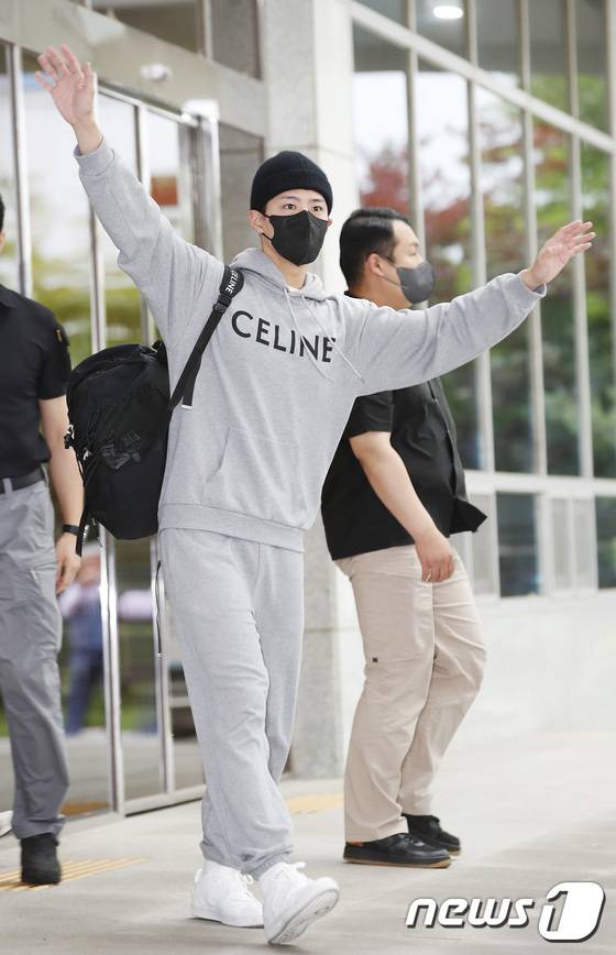 (김포공항=뉴스1) 권현진 기자 = 배우 박보검이 셀린느(CELINE) 남성 여름 2023 패션쇼를 마치고 28일 김포비즈니스항공센터를 통해 프랑스에서 귀국해 환호하는 팬들에게 인사를 하고 있다. 2022.6.28/뉴스1