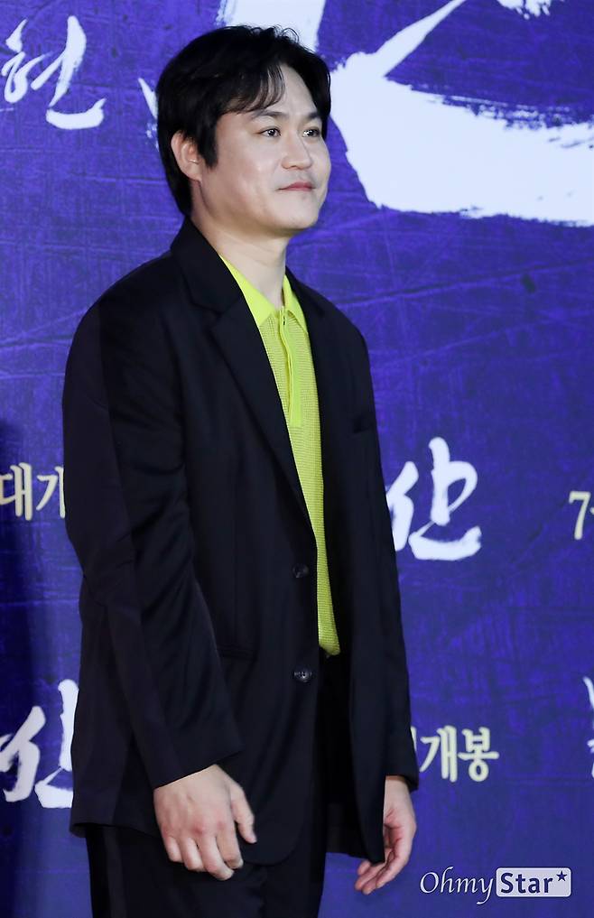 김성균 배우가 28일 오전 서울 광진구의 한 상영관에서 열린 영화 <한산: 용의 출현> 제작보고회에서 포토타임을 갖고 있다.