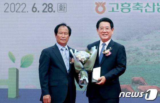 (고흥=뉴스1) 전원 기자 = 김영록 전라남도지사가 28일 전남 고흥군 동강면에서 열린 ‘고흥축협 가축시장 및 사료공장 준공식’에서 김종암 고흥축협조합장으로부터 감사패를 받고 있다. (전남도 제공) 2022.6.28/뉴스1