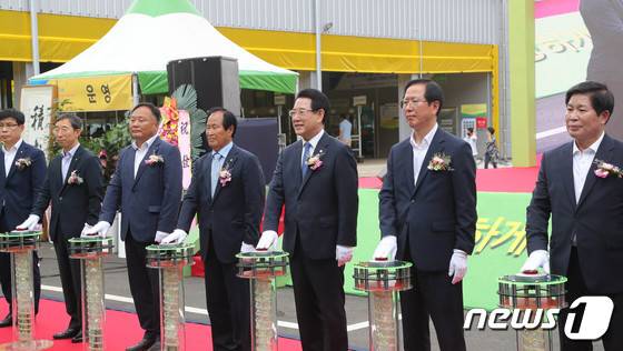(고흥=뉴스1) 전원 기자 = 김영록 전라남도지사가 28일 전남 고흥군 동강면에서 열린 ‘고흥축협 가축시장 및 사료공장 준공식’ 행사에서 내빈들과 사료공장 가동 축하 퍼포먼스를 하고 있다. (전남도 제공) 2022.6.28/뉴스1