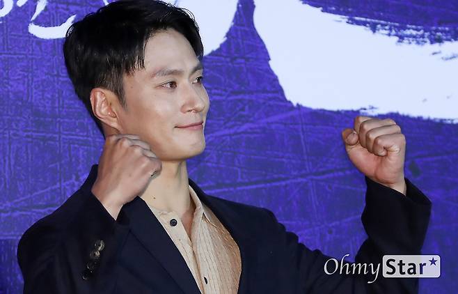 김성규 배우가 28일 오전 서울 광진구의 한 상영관에서 열린 영화 <한산: 용의 출현> 제작보고회에서 포토타임을 갖고 있다.