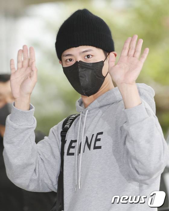 (김포공항=뉴스1) 권현진 기자 = 배우 박보검이 셀린느(CELINE) 남성 여름 2023 패션쇼를 마치고 28일 김포비즈니스항공센터를 통해 프랑스에서 귀국해 환호하는 팬들에게 인사를 하고 있다. 2022.6.28/뉴스1