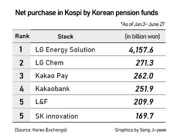 Shares of LG Chem, the second most purchased Korean stock by the local pension funds, lost 5 percent over the same period. Their third and fourth favorites Kakao Pay and Kakao Bank are doing even worse, logging negative returns of 45 percent and 19 percent, respectively.
