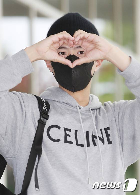 (김포공항=뉴스1) 권현진 기자 = 배우 박보검이 셀린느(CELINE) 남성 여름 2023 패션쇼를 마치고 28일 김포비즈니스항공센터를 통해 프랑스에서 귀국해 환호하는 팬들을 향해 하트를 그리고 있다. 2022.6.28/뉴스1