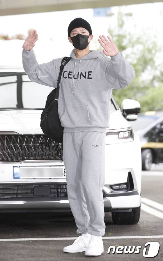 (김포공항=뉴스1) 권현진 기자 = 배우 박보검이 린느(CELINE) 남성 여름 2023 패션쇼를 마치고 28일 김포비즈니스항공센터를 통해 프랑스에서 귀국해 환호하는 팬들에게 인사를 하고 있다. 2022.6.28/뉴스1
