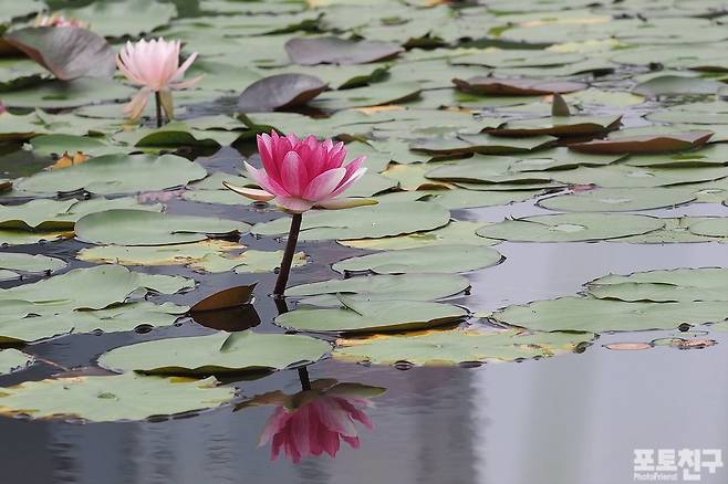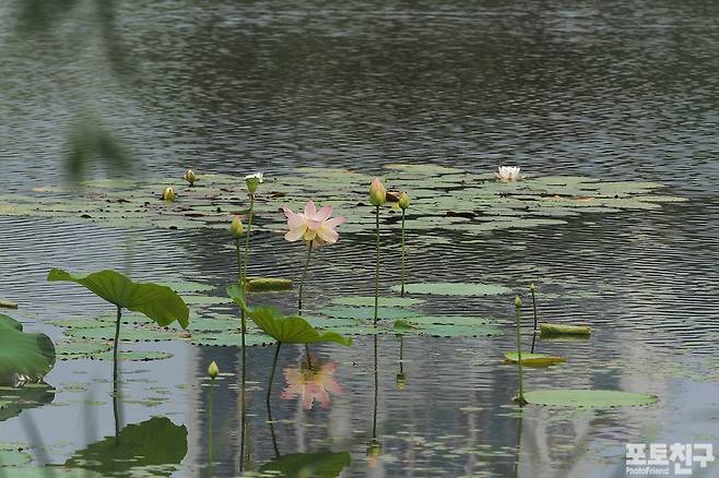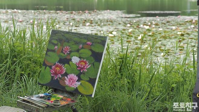 수련꽃이 곱게 핀 호수 가장자리에서