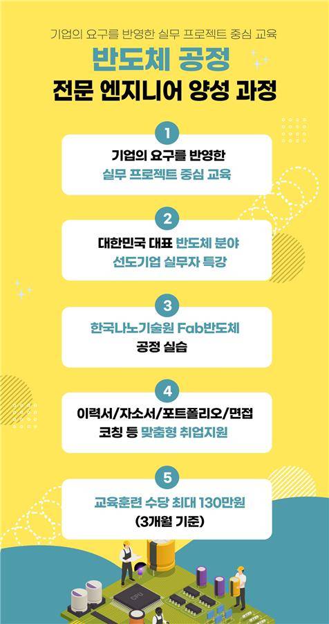 양성과정은 오는 7월 20일부터 10월 25일까지 약 3개월간 총 30여 명의 교육생을 대상으로 운영한다. 교육은 반도체 산업 및 직무, 반도체 공정, 반도체 장비 등에 대해 이론과 실무 중심으로 진행한다. 참여 희망자는 7월 13일까지 경기도미래기술학교 홈페이지를 통해 온라인 접수하면 된다.