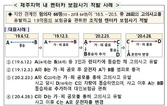 제주경찰서는 최근 10대 및 20대 64명 등 66명이 연루돼 28회의 고의 사고를 유발한 조직형 렌터가 보험사기를 적발했다. 사고 가해자가 피해자와 공모해 사고를 낸뒤 보험금을 타내거나, 지인을 동승시켜 대인 보험금을 추가로 받아내는 방식 등이 활용됐다. 사고가 잦아 의심받기 쉬운 가해자 대신 운전자를 변경하는 수법도 썼다.