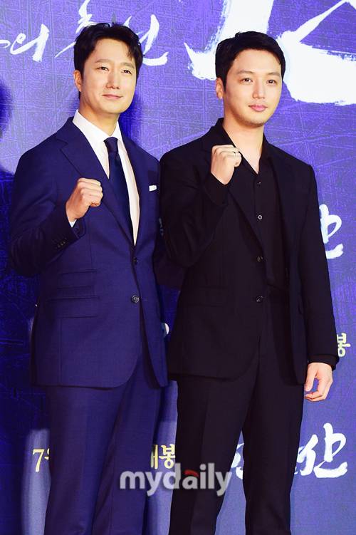 [마이데일리 = 곽경훈 기자] 영화배우 박해일과 변요한이 28일 오전 서울 건대입구 롯데시네마에서 진행된 영화 '한산: 용의 출현'(감독 김한민) 제작보고회에서 포즈를 취하고 있다.