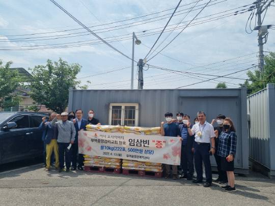[부여]부여중앙감리교회 임삼빈 장로는 최근 부여읍 행정복지센터를 방문해 관내 53개 마을 경로당과 어려운 이웃 등을 위한 백미 10kg 222포대(500만원 상당)를 기탁했다.