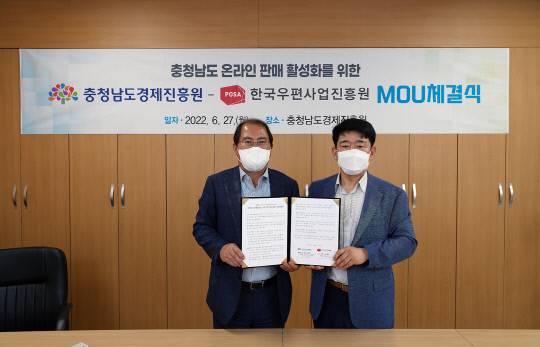 [아산]충남경제진흥원은 지난 27일 한국우편사업진흥원과 충청남도 농산물 온라인 판매 활성화를 위한 상호 협력 업무협약을 체결했다.<사진>