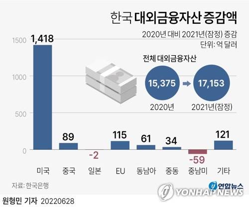 (서울=연합뉴스) 원형민 기자 = 한국은행이 28일 발표한 지역별·통화별 국제투자대조표(잠정)를 보면 지난해 '서학개미'가 크게 늘면서 대(對)미국 금융투자가 2년 연속 사상 최대 폭으로 불었다.