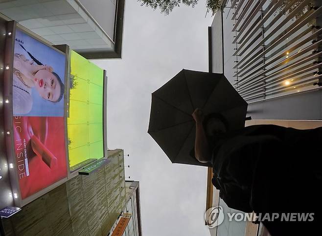 (서울=연합뉴스) 김도훈 기자 = 28일 오후 비가 내린 서울 명동 거리에서 시민이 우산을 쓰고 길을 지나고 있다.