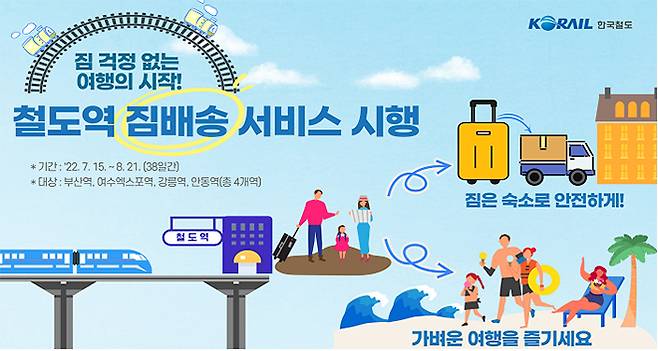 이와 함께 국토부는 여름철 휴가기간(7.15∼8.21) 주요 관광지가 위치한 부산역, 강릉역, 여수엑스포역, 안동역 등 전국 4개 철도역에서 ‘여행짐 배송 서비스’를 제공하기로 했다.