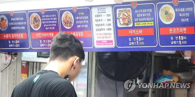 (서울=연합뉴스) 강민지 기자 = 28일 점심시간 서울 노량진 컵밥거리의 한 가게 메뉴가격이 수정되어 있다. 상인들은 치솟은 물가 여파로 재료비가 오르며 컵밥 가격을 인상했다고 전했다. 2022.6.28
