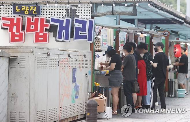 (서울=연합뉴스) 강민지 기자 = 28일 점심시간 서울 노량진 컵밥거리에서 학생들이 컵밥을 먹고 있다. 상인들은 치솟은 물가 여파로 재료비가 오르며 컵밥 가격을 인상했다고 전했다. 2022.6.28