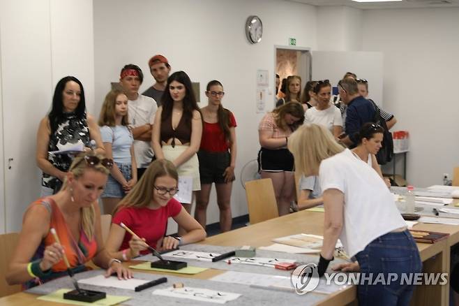 (서울=연합뉴스) 주헝가리 한국문화원이 지난 25일 2022년 부다페스트 '박물관의 밤(The Night of Museums Budapest)' 행사에 참여해 다양한 한국문화를 현지인들에게 소개했다고 28일 밝혔다. 사진은 서예 워크숍에 참여한 현지 학생들 모습. 2022.6.28 [문화체육관광부 제공. 재판매 및 DB 금지]