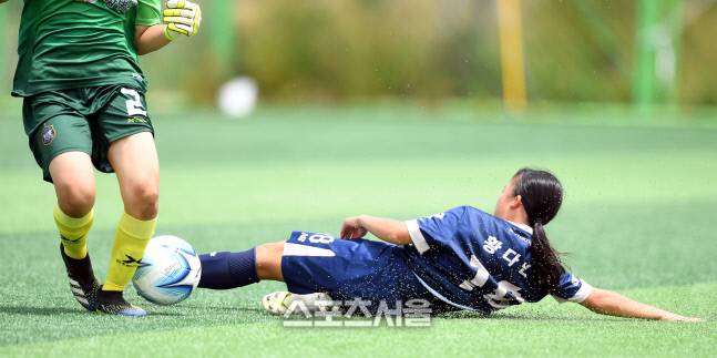 전남 광영중 황다빈이 28일 삼척복합체육공원에서 열린 제30회 여왕기 전국여자축구대회 서울 노원유나이티드U15W와 경기에서 상대 골키퍼와 볼다툼을 하고 있다.