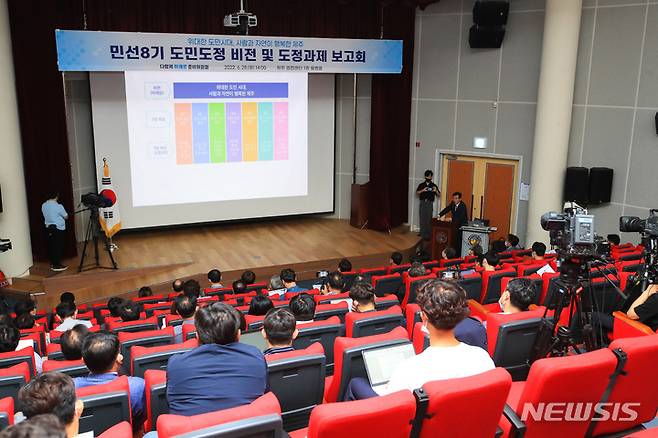 [제주=뉴시스] 우장호 기자 = 28일 오후 제주웰컴센터에서 '민선 8기 도민도정 비전 및 도정과제 보고회'가 진행되고 있다. 2022.06.28. woo1223@newsis.com