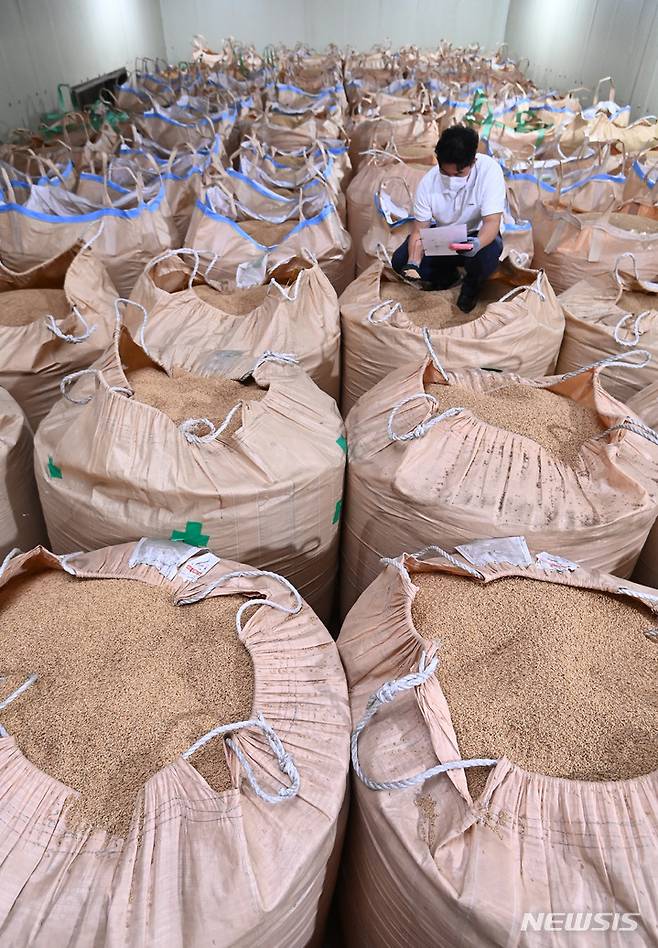 [화성=뉴시스] 김종택기자 = 쌀값 하락폭이 45년만에 최대치를 기록하고 있는 28일 오후 경기도 화성시 팔탄농협 연합미곡종합처리장 저온저장고에서 관계자가 수매된 벼를 살펴보고 있다. 최근 산지 쌀값은 80kg당 18만2136원으로 전년 수확기 평균(21만4138원)보다 14.9% 떨어졌다. 이는 쌀값 데이터 축적 이후 45년 만에 최대 하락폭이다. 2022.06.28. jtk@newsis.com