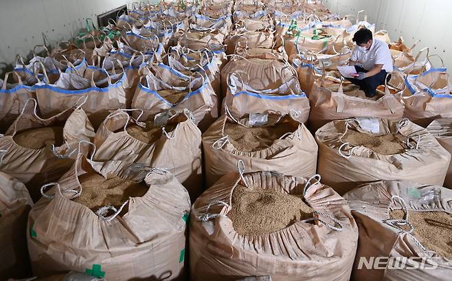 [화성=뉴시스] 김종택기자 = 쌀값 하락폭이 45년만에 최대치를 기록하고 있는 28일 오후 경기도 화성시 팔탄농협 연합미곡종합처리장 저온저장고에서 관계자가 수매된 벼를 살펴보고 있다. 최근 산지 쌀값은 80kg당 18만2136원으로 전년 수확기 평균(21만4138원)보다 14.9% 떨어졌다. 이는 쌀값 데이터 축적 이후 45년 만에 최대 하락폭이다. 2022.06.28. jtk@newsis.com