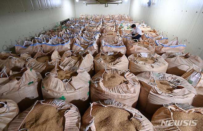 [화성=뉴시스] 김종택기자 = 쌀값 하락폭이 45년만에 최대치를 기록하고 있는 28일 오후 경기도 화성시 팔탄농협 연합미곡종합처리장 저온저장고에서 관계자가 수매된 벼를 살펴보고 있다. 최근 산지 쌀값은 80kg당 18만2136원으로 전년 수확기 평균(21만4138원)보다 14.9% 떨어졌다. 이는 쌀값 데이터 축적 이후 45년 만에 최대 하락폭이다. 2022.06.28. jtk@newsis.com