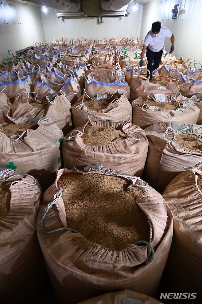 [화성=뉴시스] 김종택기자 = 쌀값 하락폭이 45년만에 최대치를 기록하고 있는 28일 오후 경기도 화성시 팔탄농협 연합미곡종합처리장 저온저장고에서 관계자가 수매된 벼를 살펴보고 있다. 최근 산지 쌀값은 80kg당 18만2136원으로 전년 수확기 평균(21만4138원)보다 14.9% 떨어졌다. 이는 쌀값 데이터 축적 이후 45년 만에 최대 하락폭이다. 2022.06.28. jtk@newsis.com