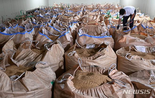 [화성=뉴시스] 김종택기자 = 쌀값 하락폭이 45년만에 최대치를 기록하고 있는 28일 오후 경기도 화성시 팔탄농협 연합미곡종합처리장 저온저장고에서 관계자가 수매된 벼를 살펴보고 있다. 최근 산지 쌀값은 80kg당 18만2136원으로 전년 수확기 평균(21만4138원)보다 14.9% 떨어졌다. 이는 쌀값 데이터 축적 이후 45년 만에 최대 하락폭이다. 2022.06.28. jtk@newsis.com