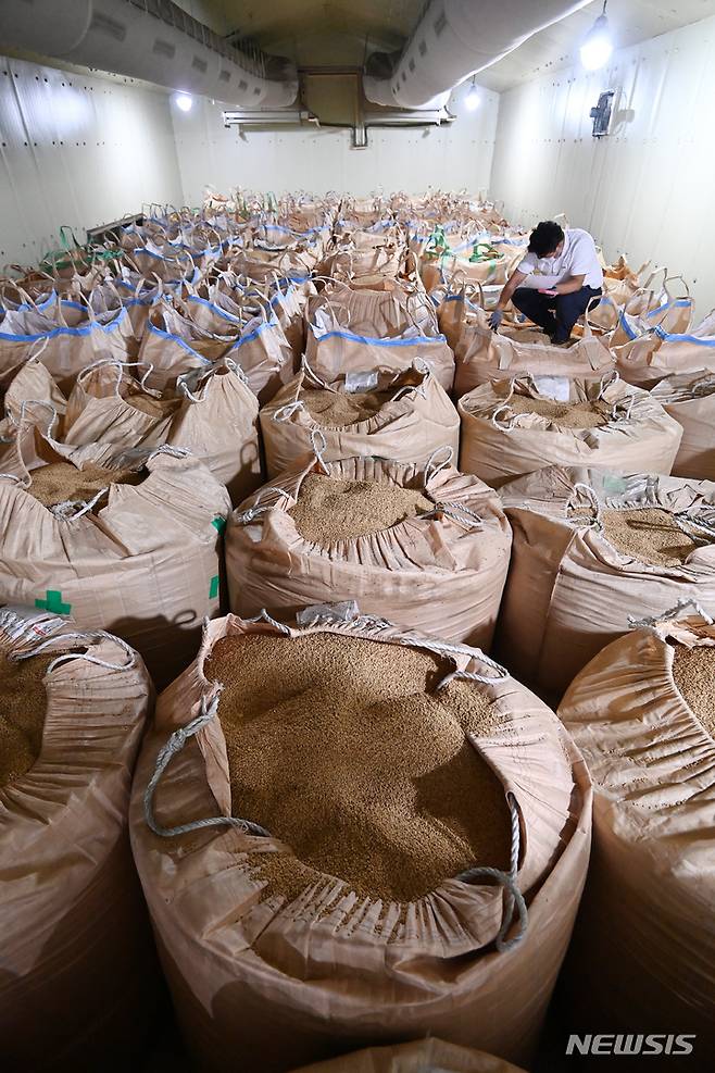 [화성=뉴시스] 김종택기자 = 쌀값 하락폭이 45년만에 최대치를 기록하고 있는 28일 오후 경기도 화성시 팔탄농협 연합미곡종합처리장 저온저장고에서 관계자가 수매된 벼를 살펴보고 있다. 최근 산지 쌀값은 80kg당 18만2136원으로 전년 수확기 평균(21만4138원)보다 14.9% 떨어졌다. 이는 쌀값 데이터 축적 이후 45년 만에 최대 하락폭이다. 2022.06.28. jtk@newsis.com