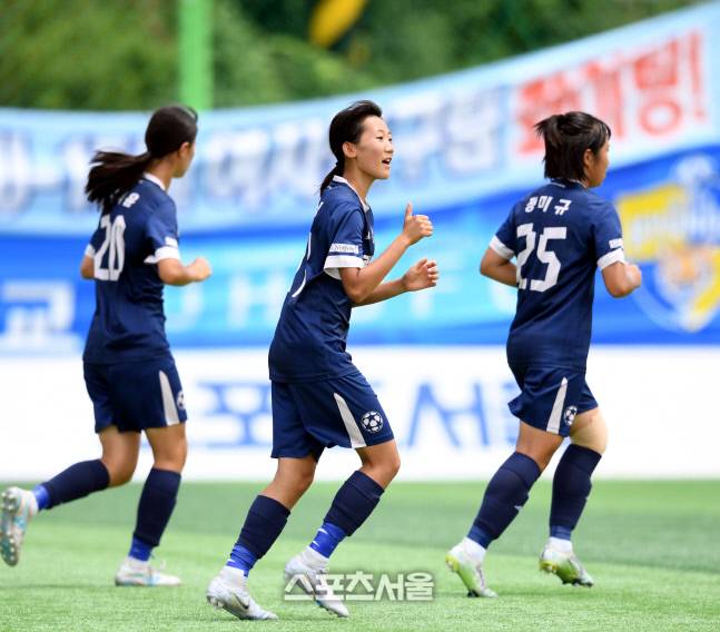 전남 광영중 안수정(가운데)가 28일 삼척복합체육공원에서 열린 제30회 여왕기 전국여자축구대회 서울 노원유나이티드U15W와 경기에서 골을 넣은 후 환호하고 있다.