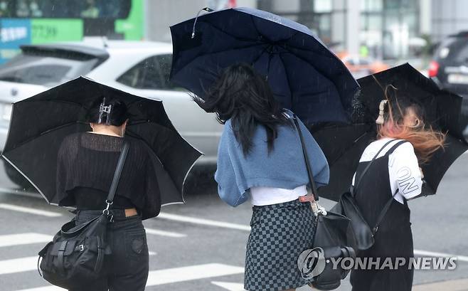 (서울=연합뉴스) 류영석 기자 = 서울에 강풍을 동반한 소나기가 내린 28일 오후 서울 마포구 지하철 홍대입구역 인근 횡단보도에서 시민들이 비바람을 맞고 있다. 2022.6.28