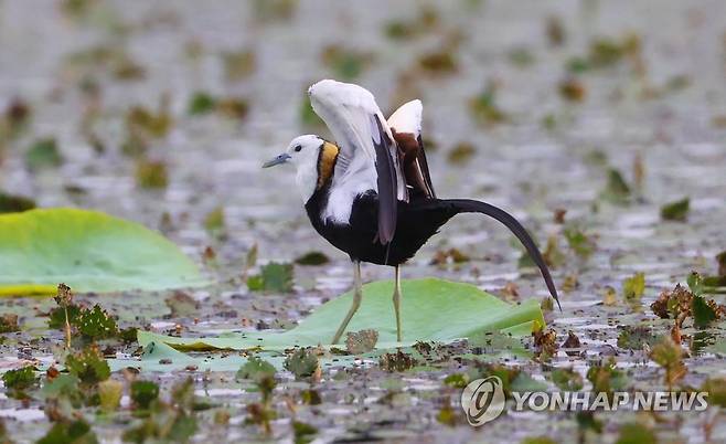 물꿩은 아열대기후에서 서식하고 현재 5마리가 주남저수지에서 관찰되고 있다. 2022.6.28 [최종수 생태사진작가 제공. 재판매 및 DB 금지]