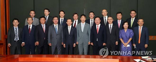 (서울=연합뉴스) 임화영 기자 = 이복현 금융감독원장(아랫줄 왼쪽 여섯 번째)과 증권사 및 자산운용사 금융투자업계 대표들이 28일 서울 여의도 금융투자협회에서 열린 금융투자권역 CEO 간담회를 하기 전 기념촬영을 위해 입장하고 있다. 2022.6.28 [공동취재]