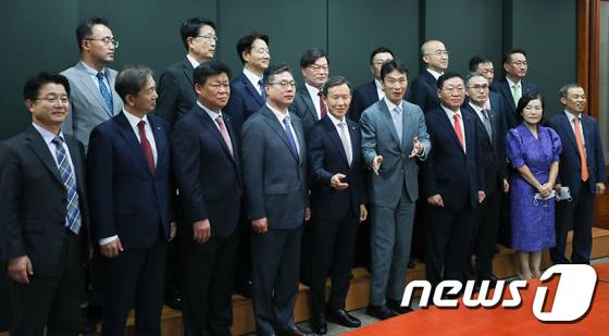 (서울=뉴스1) 허경 기자 = 이복현 금융감독원장이 28일 서울 여의도 금융투자협회에서 열린 금융투자권역 최고경영자 간담회에서 나재철 금융투자협회장 비롯한 참석자들과 기념 촬영을 하고 있다. 2022.6.28/뉴스1