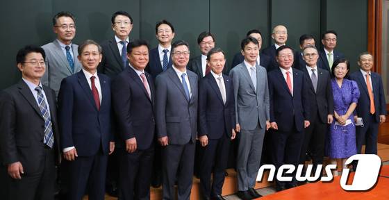(서울=뉴스1) 허경 기자 = 이복현 금융감독원장이 28일 서울 여의도 금융투자협회에서 열린 금융투자권역 최고경영자 간담회에서 나재철 금융투자협회장 비롯한 참석자들과 기념 촬영을 하고 있다. 2022.6.28/뉴스1