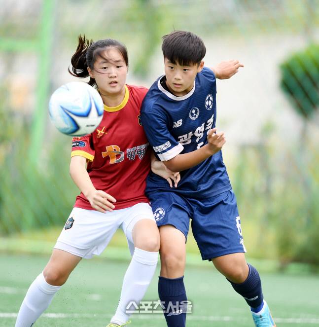 전남 광영중 정재연(오른쪽)이 28일 삼척복합체육공원에서 열린 제30회 여왕기 전국여자축구대회 서울 노원유나이티드U15W와 경기에서 상대 김서윤과 볼다툼을 하고 있다.