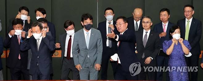 (서울=연합뉴스) 임화영 기자 = 이복현 금융감독원장과 증권사 및 자산운용사 금융투자업계 대표들이 28일 서울 여의도 금융투자협회에서 열린 금융투자권역 CEO 간담회에서 기념촬영을 마친 뒤 이동하고 있다. 2022.6.28 [공동취재]