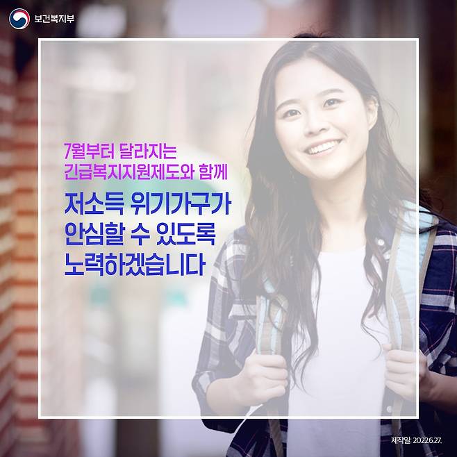 7월부터 달라지는 긴급복지지원 제도와 함께 저소득 위기가구가 안심할 수 있도록 노력하겠습니다.