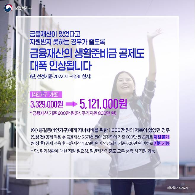 ◆ 금융 재산이 있었다고 지원받지 못하는 경우가 줄도록 금융 재산의 생활 준비금 공제도 대폭 인상됩니다.