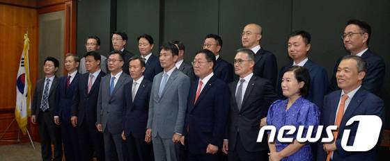 (서울=뉴스1) 허경 기자 = 이복현 금융감독원장이 28일 서울 여의도 금융투자협회에서 열린 금융투자권역 최고경영자 간담회에서 나재철 금융투자협회장 비롯한 참석자들과 기념 촬영을 하고 있다. (공동취재) 2022.6.28/뉴스1