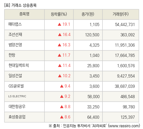 상승한 종목으로 메타랩스(090370) 19.1%, 조선선재(120030) 16.4%, 범양건영(002410) 16.3% 등이 있다.