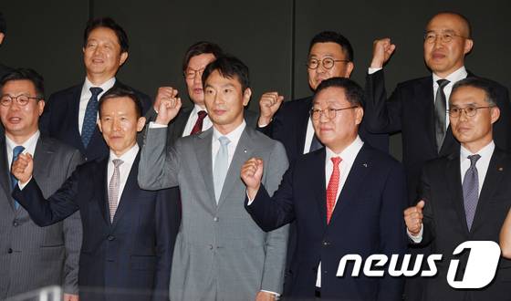 (서울=뉴스1) 허경 기자 = 이복현 금융감독원장이 28일 서울 여의도 금융투자협회에서 열린 금융투자권역 최고경영자 간담회에서 나재철 금융투자협회장 비롯한 참석자들과 기념촬영을 하고 있다. (공동취재) 2022.6.28/뉴스1