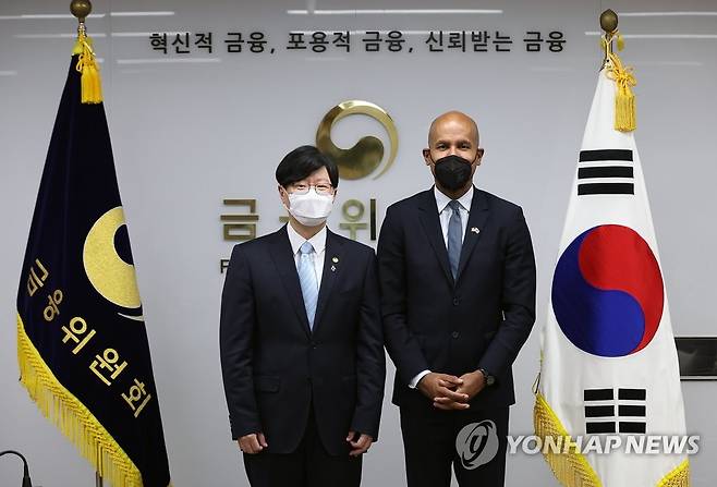 (서울=연합뉴스) 김소영 금융위원회 부위원장(왼쪽)이 28일 오후 정부서울청사에서 브라이언 넬슨 미국 재무부 차관과 기념 촬영하고 있다. 2022.6.28 [금융위원회 제공. 재판매 및 DB 금지]