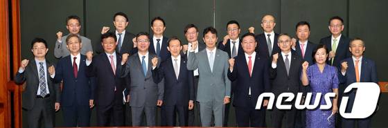 (서울=뉴스1) 허경 기자 = 이복현 금융감독원장이 28일 서울 여의도 금융투자협회에서 열린 금융투자권역 최고경영자 간담회에서 나재철 금융투자협회장 비롯한 참석자들과 기념 촬영을 하고 있다. (공동취재) 2022.6.28/뉴스1