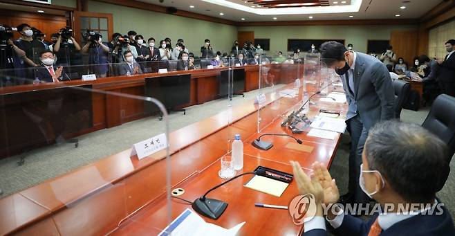 (서울=연합뉴스) 임화영 기자 = 이복현 금융감독원장이 28일 서울 여의도 금융투자협회에서 열린 금융투자권역 CEO 간담회에서 증권사 및 자산운용사 금융투자업계 대표들을 향해 인사하고 있다. 2022.6.28 [공동취재]
