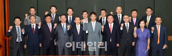 [이데일리 김태형 기자] 이복현(앞줄 왼쪽 여섯번째) 금감원장이 28일 오후 서울 영등포구 한국금융투자협회에서 열린 '금융투자권역 CEO 간담회'에서 나재철 금융투자협회장 비롯한 참석자들과 기념촬영을 하고 있다.