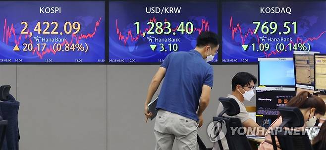 (서울=연합뉴스) 김도훈 기자 = 코스피가 개인 매수에 힘입어 2,420대로 올라선 28일 오후 서울 중구 하나은행 딜링룸 스크린에 지수가 띄워져 있다.