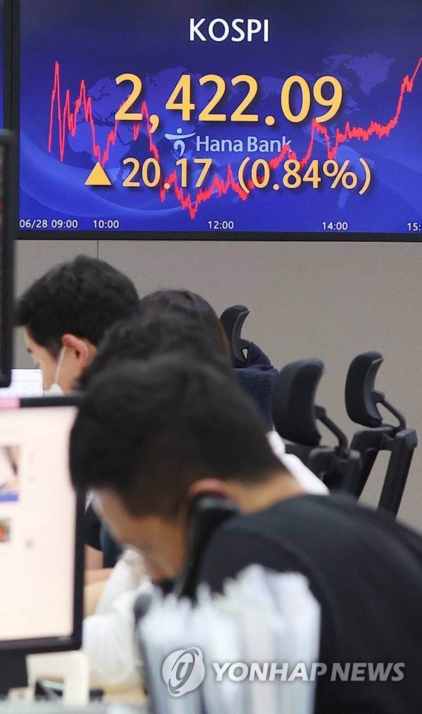 이날 코스피는 전 거래일보다 20.17포인트(0.84%) 오른 2,422.09로 거래를 마쳤다. 2022.6.28