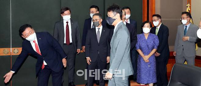 [이데일리 김태형 기자] 이복현 금감원장과 9개 증권사, 7개 자산운용사 등 금융투자업계 대표들이 28일 오후 서울 영등포구 한국금융투자협회에서 열린 '금융투자권역 CEO 간담회'에서 기념촬영을 하기 위해 이동하고 있다.